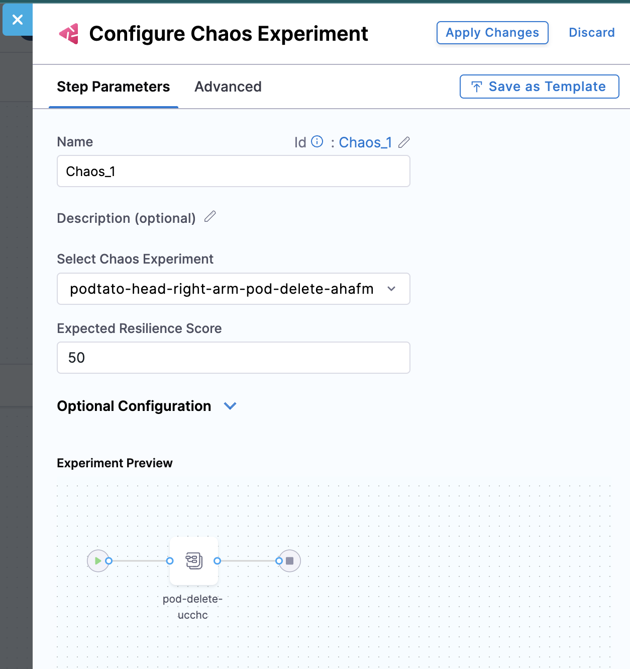 - Select Add Experiment to ChaosHub to save this experiment as a template in a selected ChaosHub.