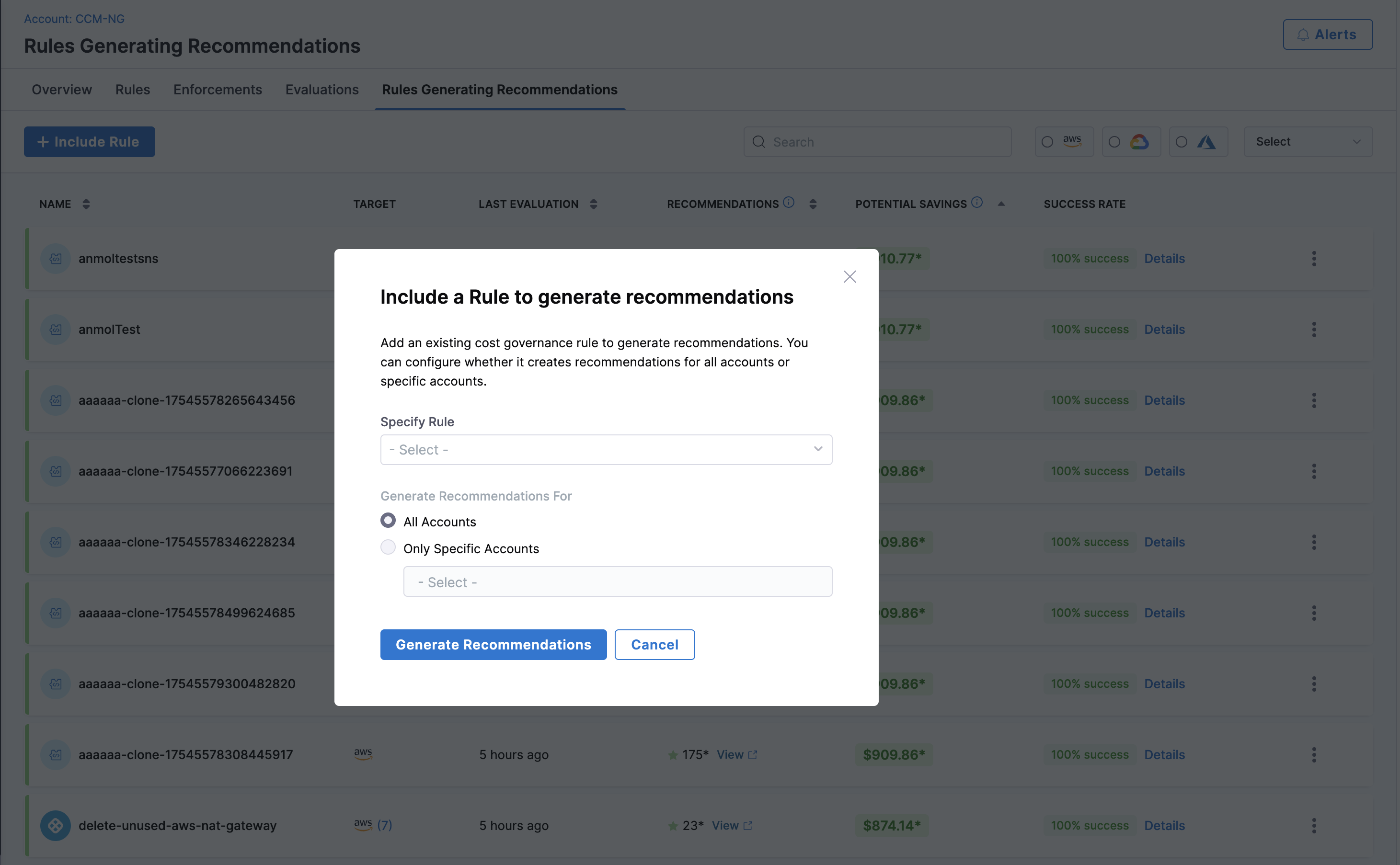 - Click on "Rules Generating Recommendations" tab. Click the +Include Rule button to add an existing cost governance rule