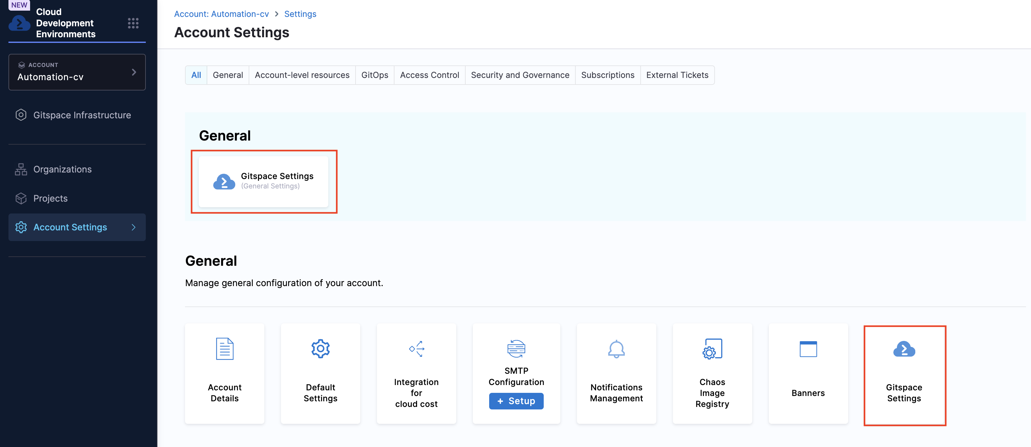 These settings can be accessed from Account Settings > General. They apply to all Gitspaces in the account. Only CDE admins can modify these settings; other CDE users can view them but not make changes. Go to Access Control to learn more about CDE roles.