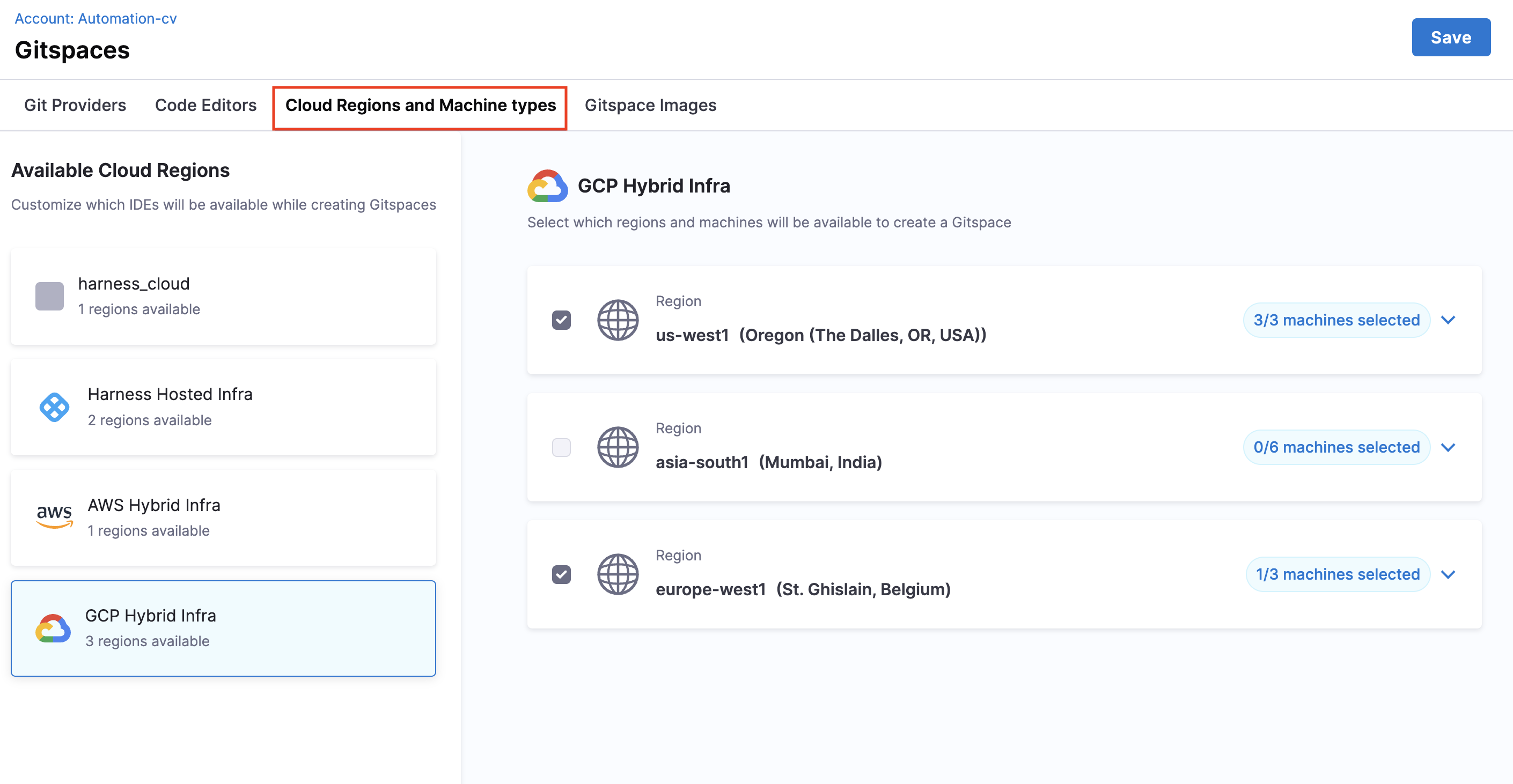 Use this setting to control available cloud regions and machine types. For each infrastructure provider, you can:
