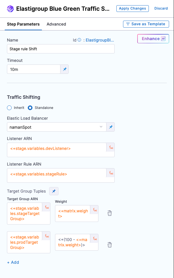 - Add the Elastigroup Blue-Green Traffic Shifting step with isTrafficShift: trueand provide thestageTargetGroupArn.