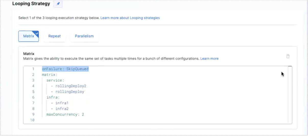 The matrix strategy defines two variables—service and infra with each service rollingDeploy2 and rollingDeploy1 deployed across both infra1 and infra2.