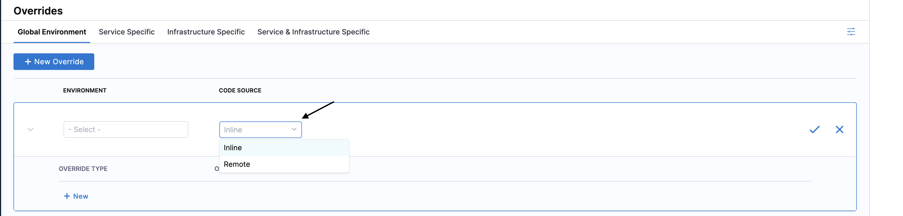 Under the Global Environment tab, select your Environment. You have the option to select Inline or Remote code source under all override methods.
