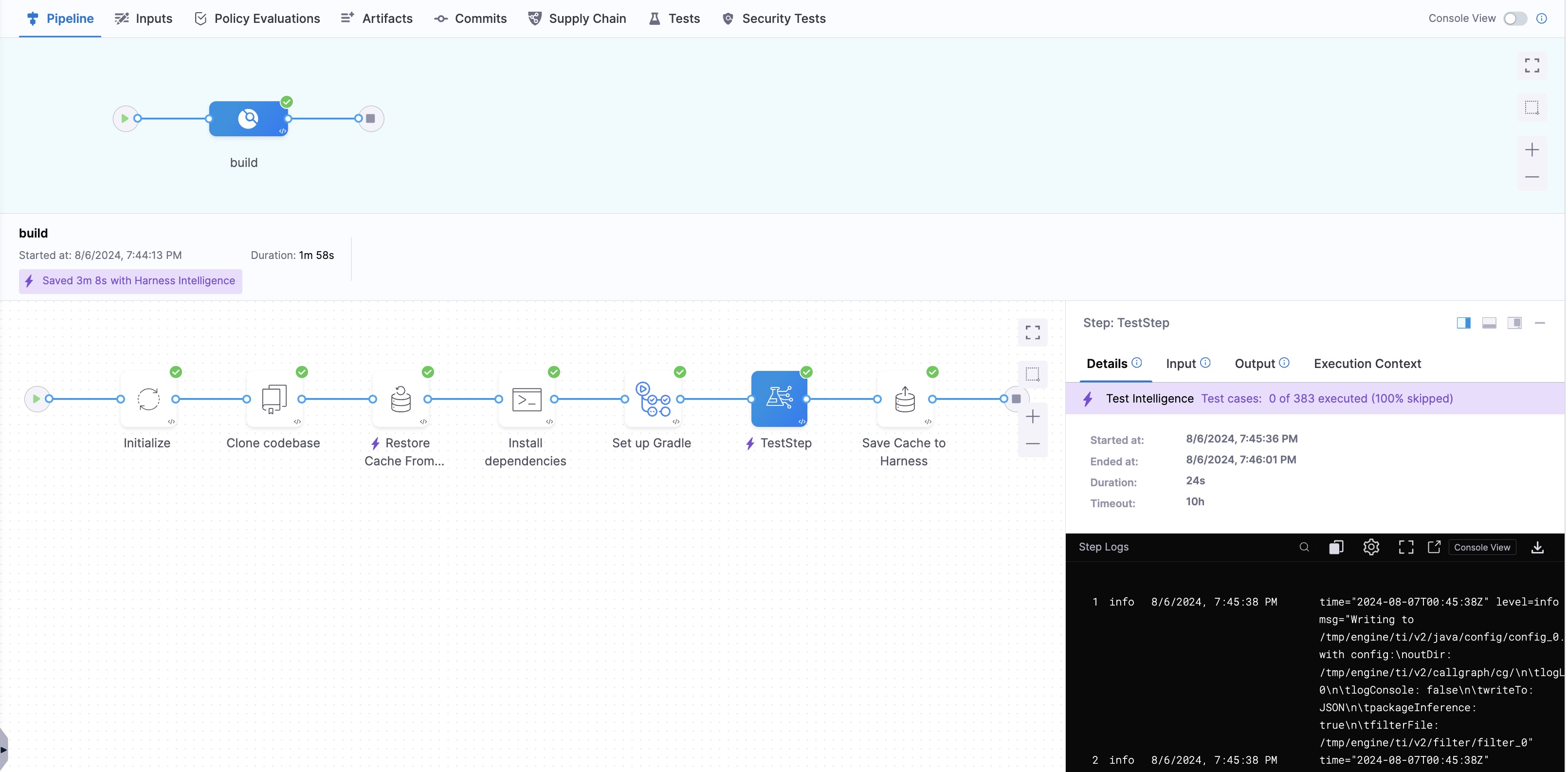 Below is a screenshot demonstrating the time savings for a Build stage using Cache Intelligence and Test Intelligence.