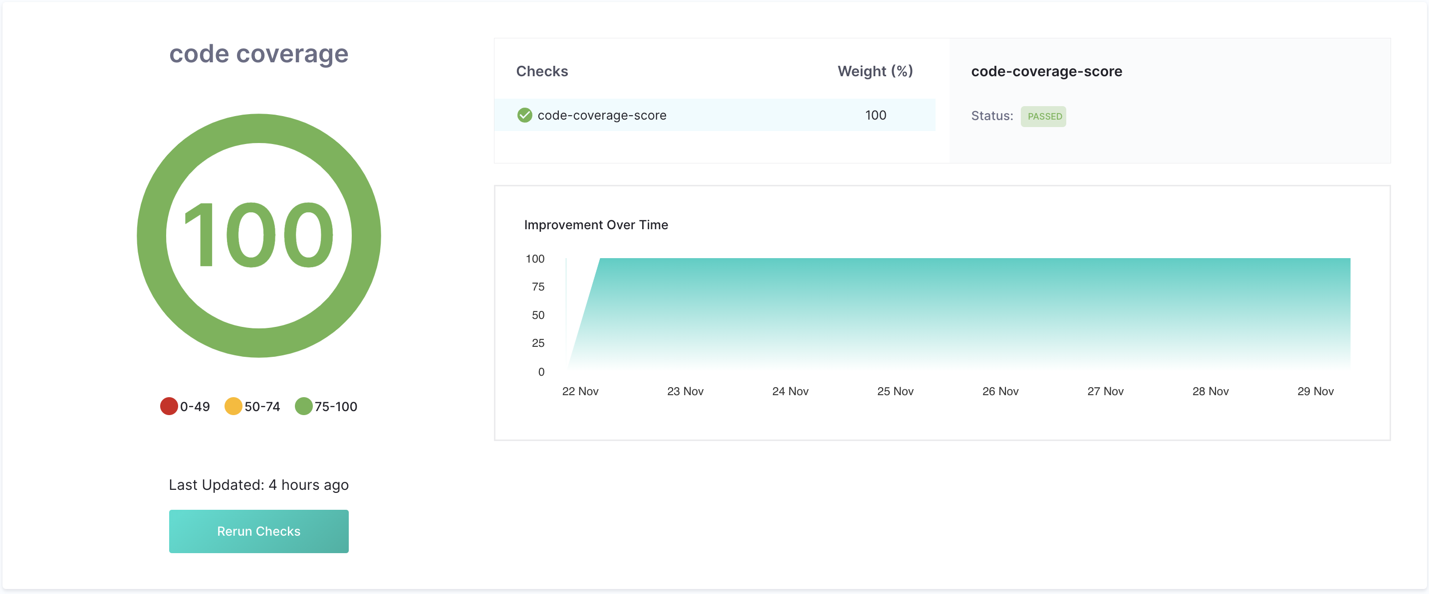 1. Now go to the Warehouse Software Component in the Catalog, and you'll find the Code Coverage Scorecard under Scorecards tab and on the overview page. You can read more about it here