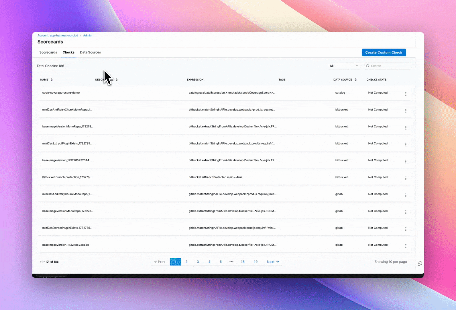 2. Now select Create Custom Check and add a New Custom Check to check the code coverage score, select the data source as Catalog Info YAML and data point as Evaluate Expression(JEXL).