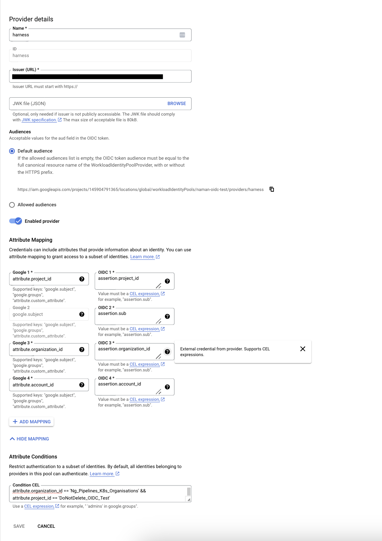 - Provider ID: projects/421331508843/locations/global/workloadIdentityPools/harness-pool/providers/harness-provider