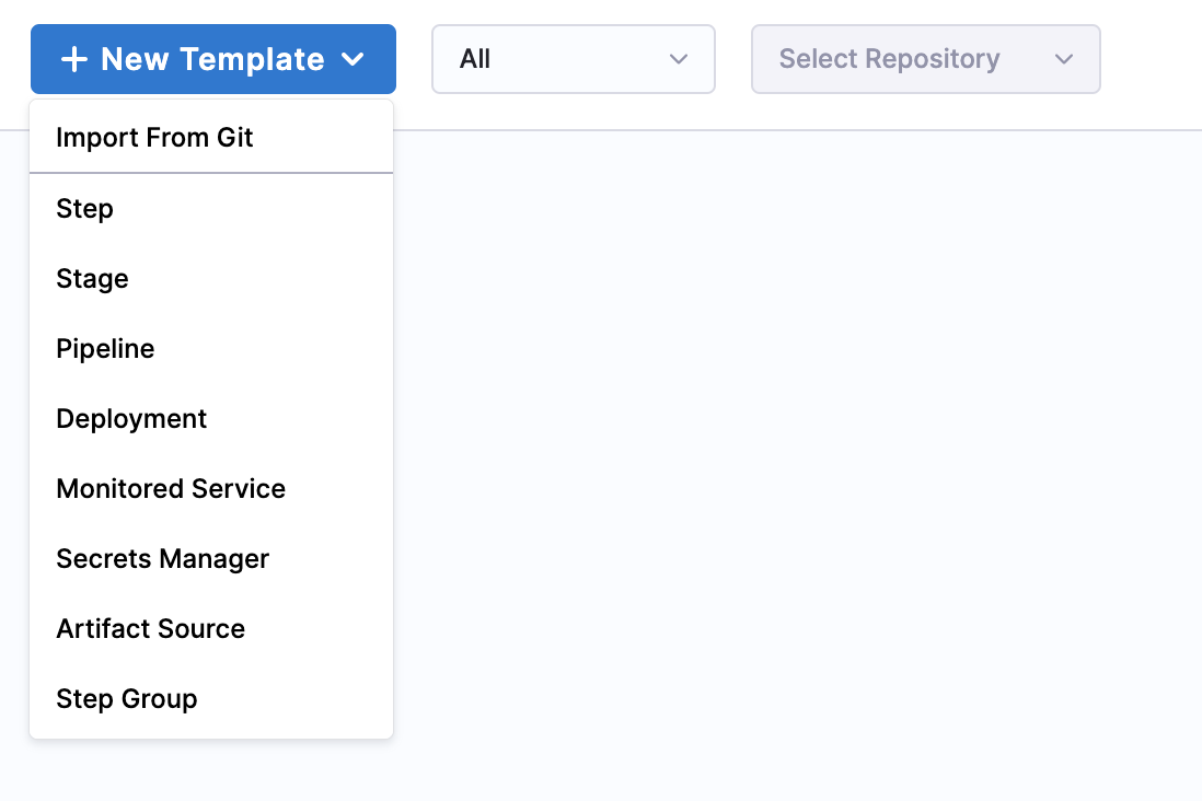 In Repository, select your repository. noteIf your repository is not listed, enter the repository name to search and select it. Create the repository in Git before entering it in Select Repository. Harness does not create the repository for you.