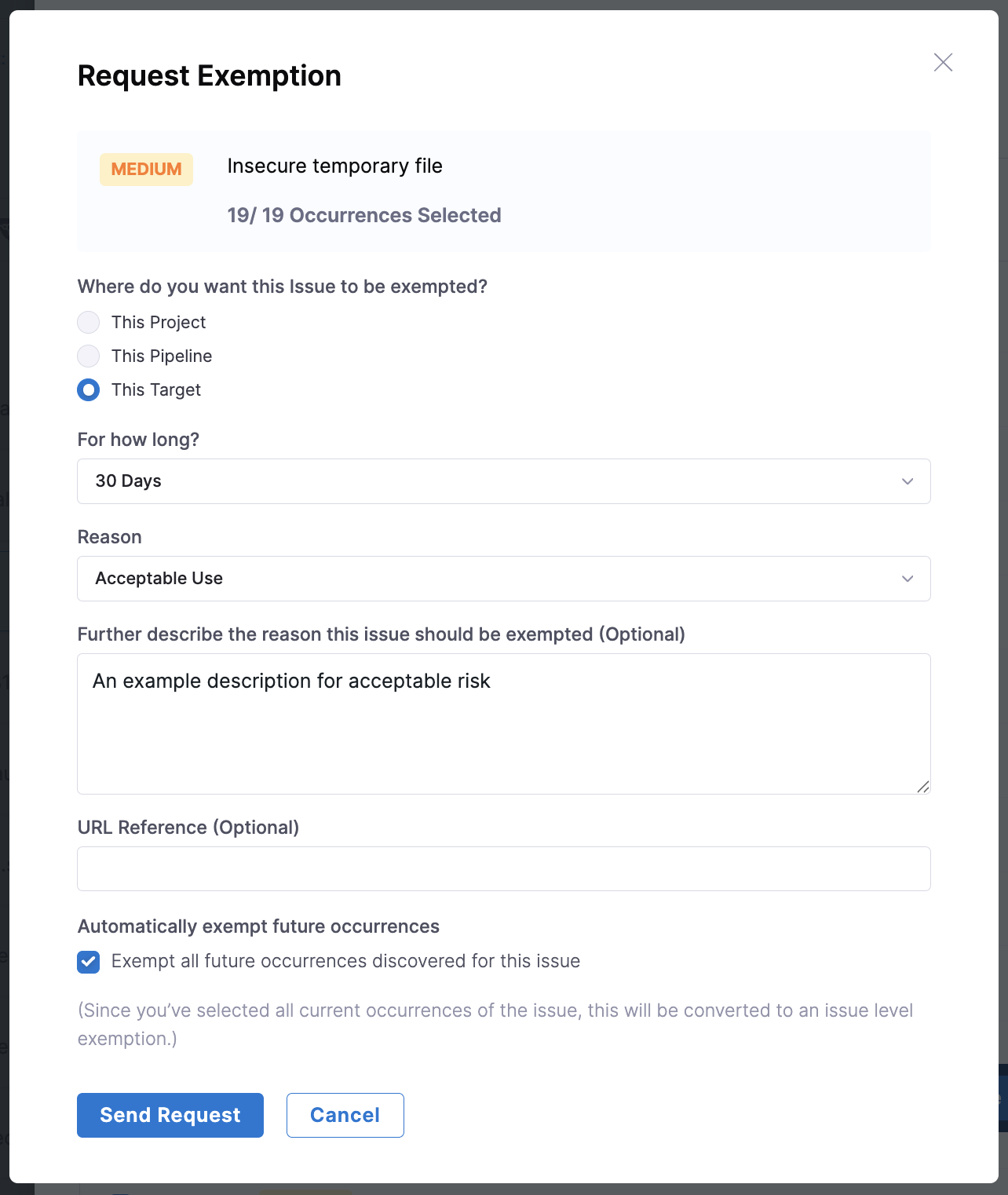 - The option Exempt all future occurrences discovered for this issue at the bottom becomes available. Checking this option converts the request from an occurrence-level exemption to an issue-level exemption. This ensures all future occurrences of the issue will automatically be exempted.
