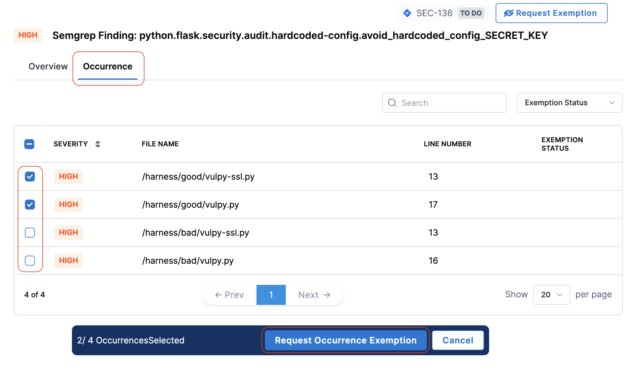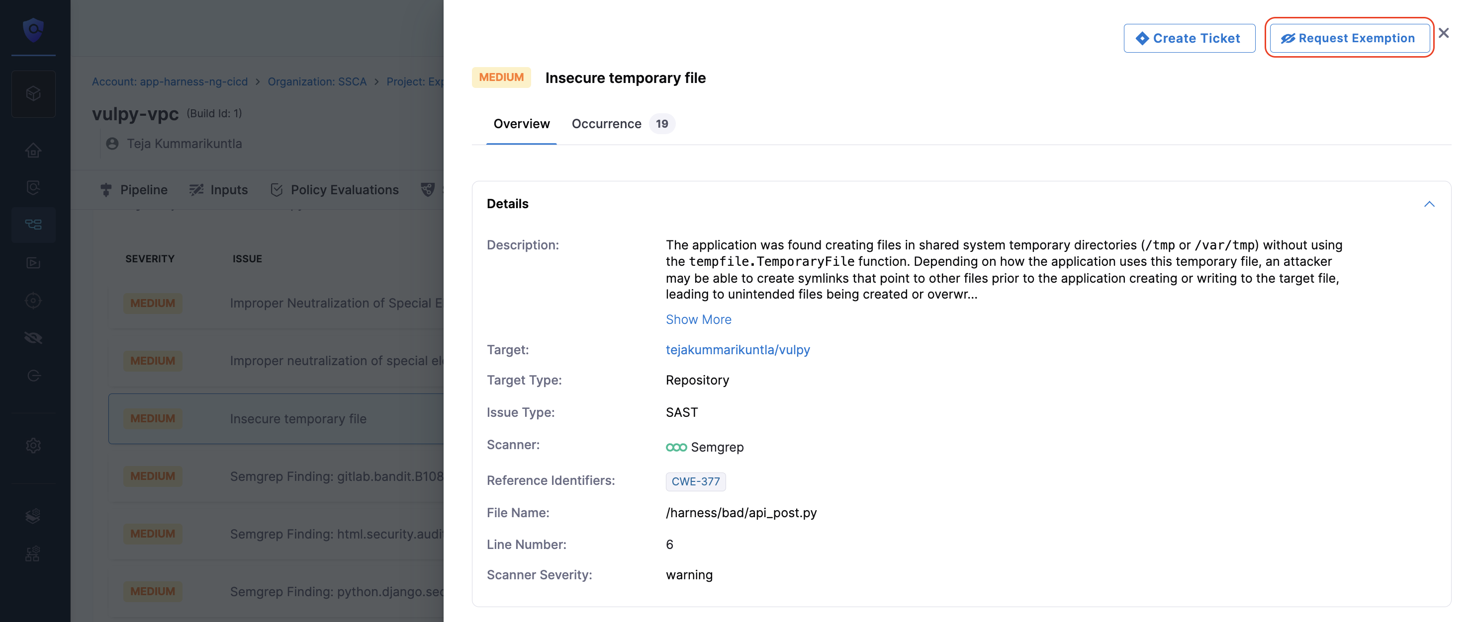 - As you create exemption request at the issue level, all the future occurrences part of this issues will be automatically exempted. For exemptions at occurrences level, refer to Create Exemption Request for Occurrences within Issue