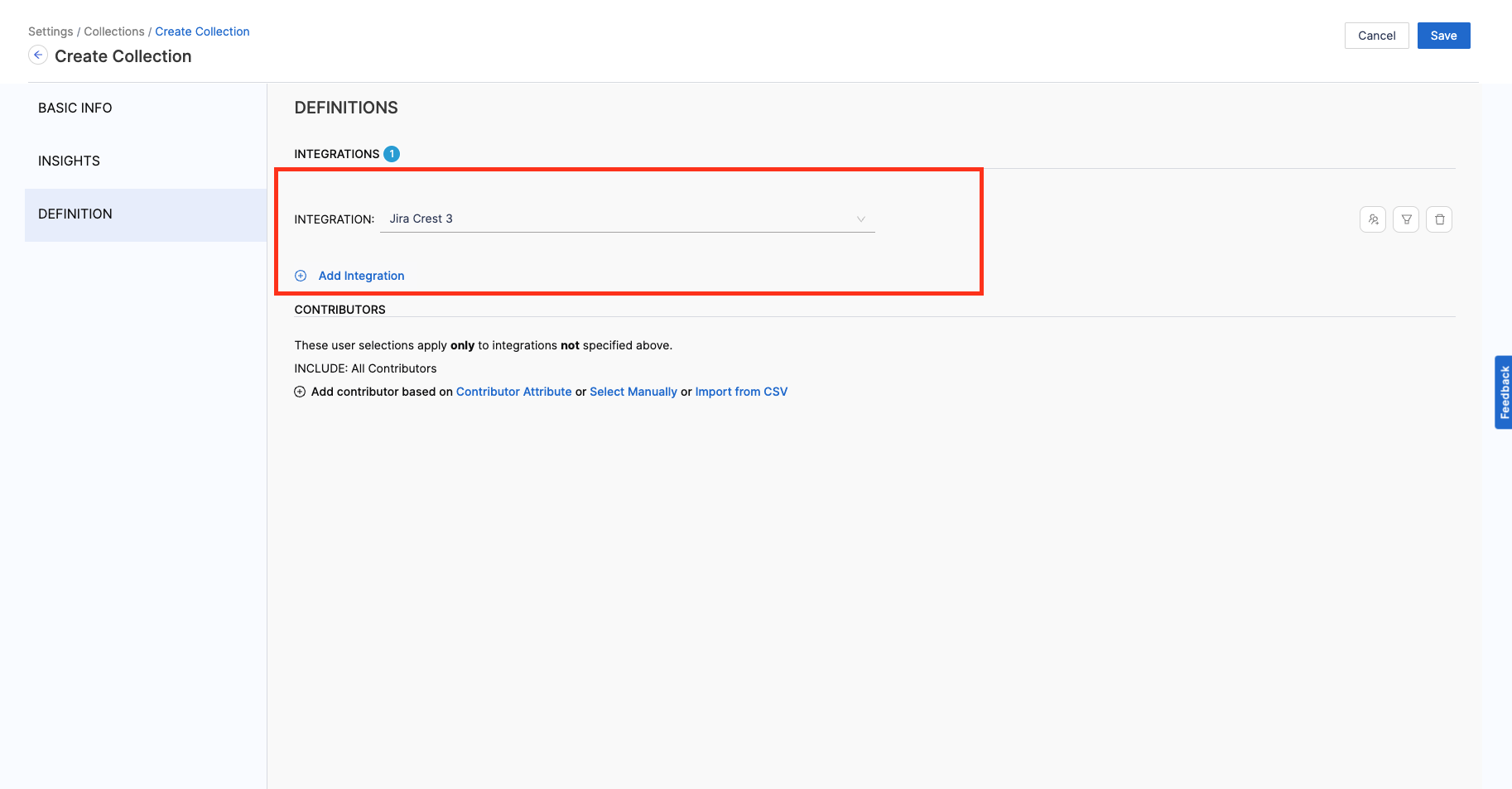To define a collection based on a specific asset, you will have to add the respective integration and associated integration filters in the Collection definition settings. This enables you to define the criteria that determine how contributors will be associated with the collection.