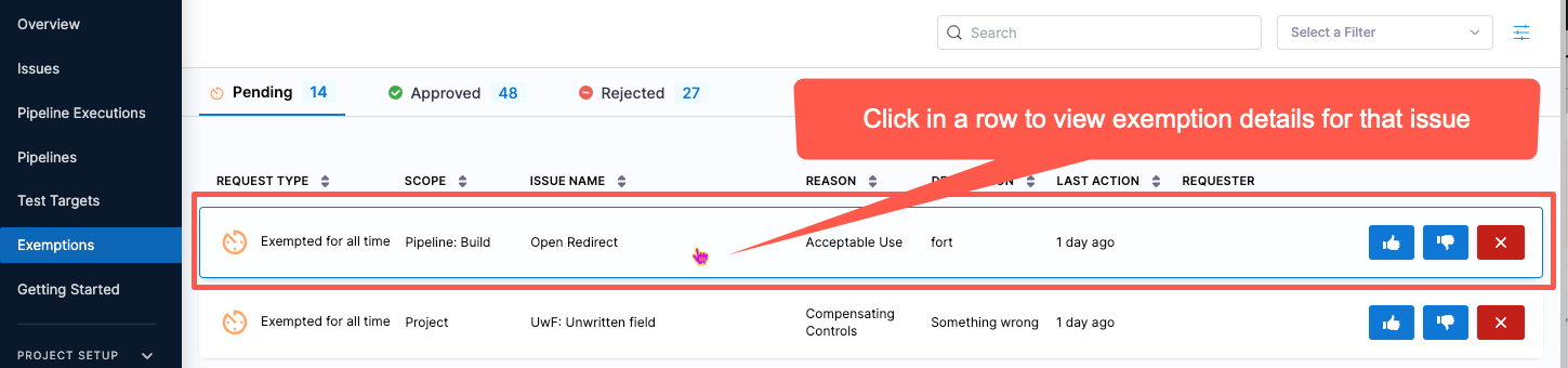 • You can click on a row in the Exemptions table to view details for the issue associated with that exemption.