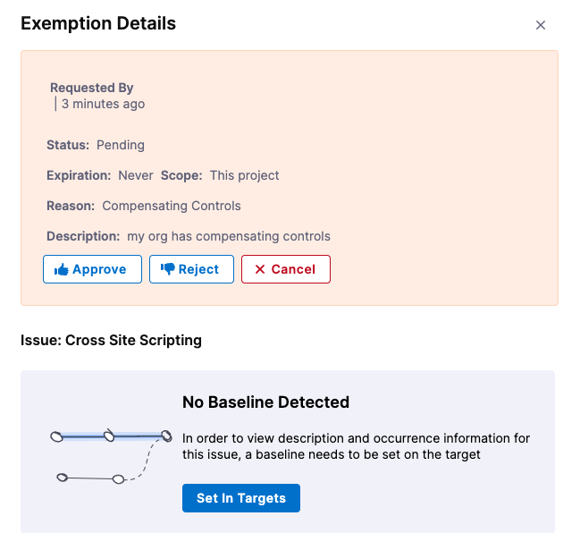 • For best results in STO, you should specify a baseline for every target. To encourage this, the Exemption Details pane hides details for an issue if there is no baseline detected. To specify the baseline, select Set in Targets.